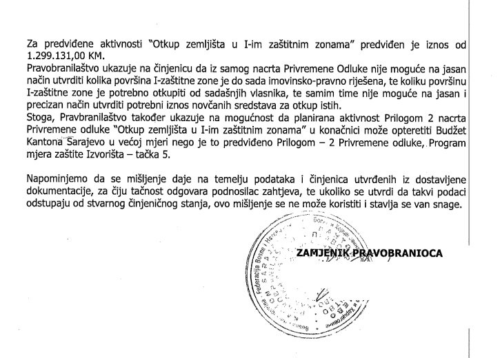 U priloženoj dokumentaciji je, također, zanimljiv i stav Pravobranilaštva KS. Naime, iz Pravobranilaštva su ukazali na činjenicu da iz samog nacrta Privremene odluke nije moguće na jasan način utvrditi kolika površina vodozaštitne zone I je do sada imovinsko-pravno riješena. Isto tako i koliko površinu te zone je potrebno otkupiti od sadašnjih vlasnika.